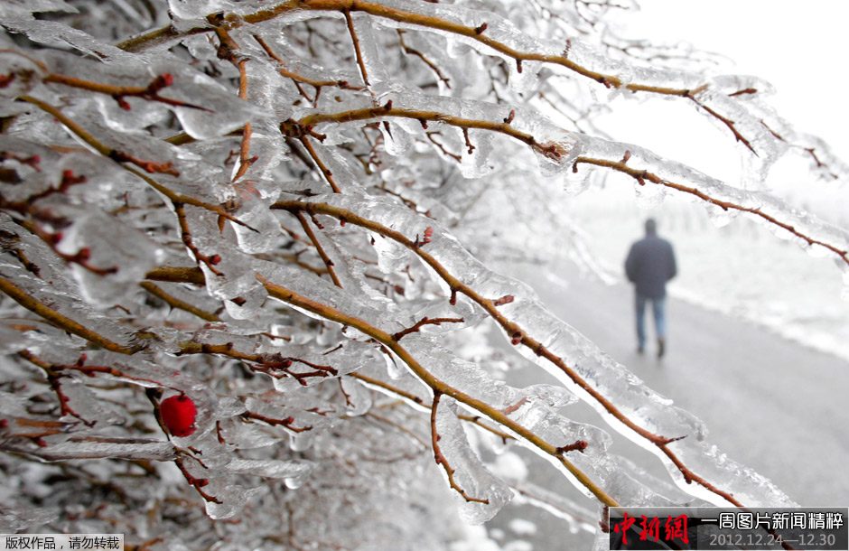 12月25日,奥地利首都维也纳外围的一条车道旁,野蔷薇的枝干上挂着冰。