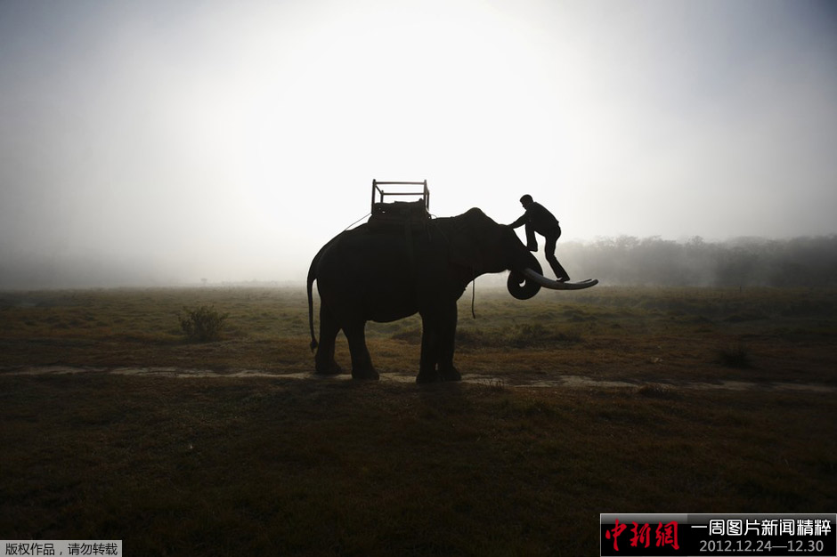 12月28日,尼泊尔奇特旺,一名“象夫”爬上大象,他们在前往一场大象选美赛的途中。