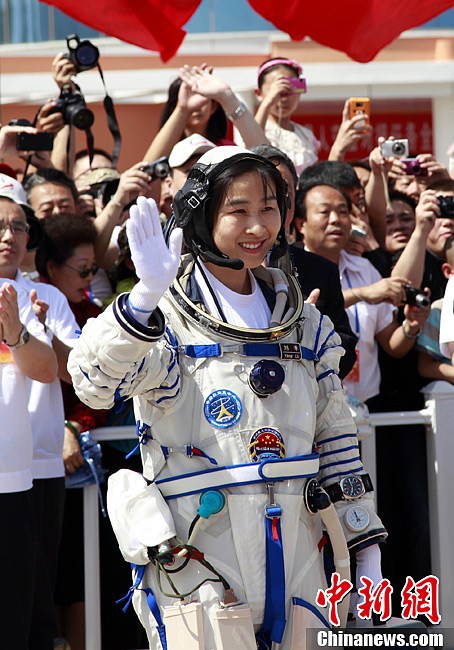 中国新闻社2012年度新闻图片精选——2012年6月16日下午,神舟九号任务飞行乘组3名航天员景海鹏、刘旺、刘洋受命出征太空。中国首位女航天员刘洋面带微笑挥手告别送行人群。中新社记者 孙自法 摄