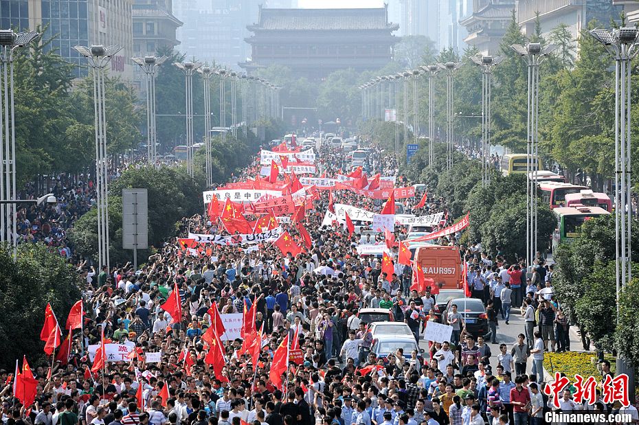 中国新闻社2012年度新闻图片精选——2012年9月15日,陕西省西安市爆发万人游行,抗议日本政府非法“购买”中国钓鱼岛及其附属岛屿。中新社记者 张远 摄