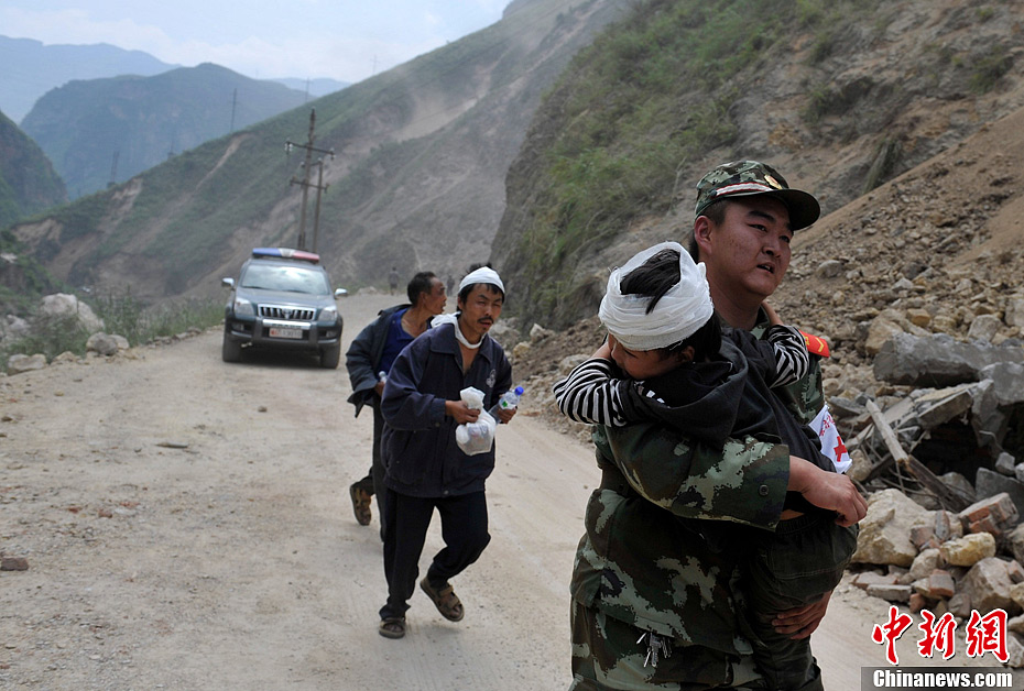 中国新闻社2012年度新闻图片精选——2012年9月8日,云南彝良地震灾区余震不断,武警官兵怀抱受伤儿童快速通过滚石路段。中新社记者 刘冉阳 摄
