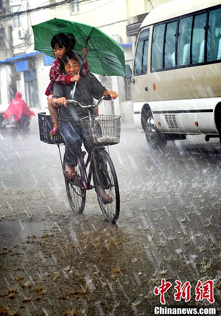 中国新闻社2012年度新闻图片精选——2012年7月30日,山西太原,一对祖孙在暴雨中艰难骑行。中新社记者 韦亮 摄