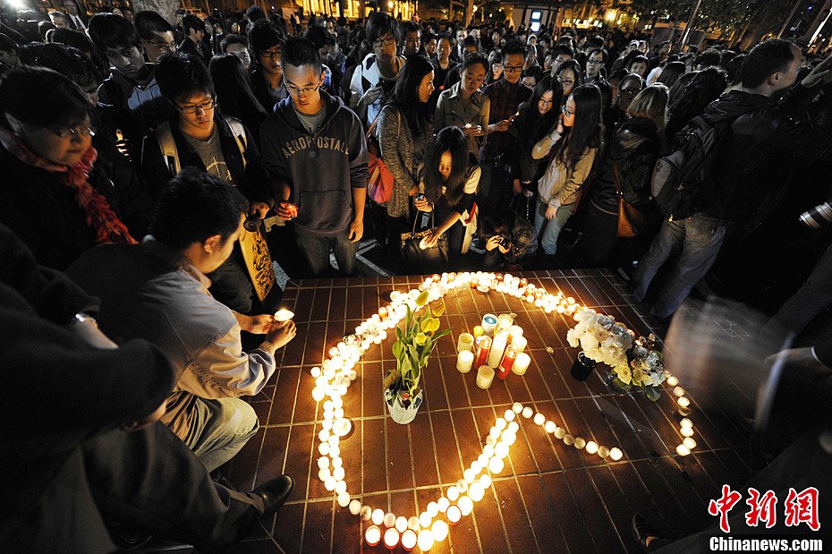 中国新闻社2012年度新闻图片精选——2012年4月11日晚,南加州大学上千名同学在洛杉矶雨后的瑟瑟寒风中手捧蜡烛与鲜花,含泪悼念于当日凌晨不幸中枪遇害的两名中国留学生。中新社记者 毛建军 摄