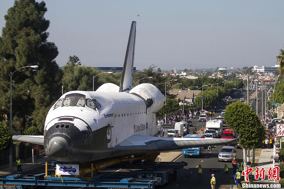 中国新闻社2012年度新闻图片精选——2012年10月13日,退役的美国奋进号航天飞机在运往加州科学技术中心途中经过洛杉矶街头。这次独特的运输任务10月12日凌晨始于洛杉矶国际机场,沿途吸引了众多市民围观见证。中新社发 林戈 摄