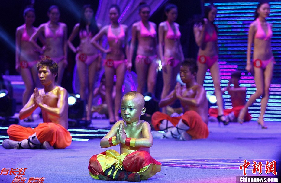 12月30日晚,来自少林武僧团5岁半的释小艺静坐在泳装小姐美腿如林的舞台上纹丝不动。当日,“忆诚杯”2012中国(广州)国际模特大赛华中区总决赛颁奖盛典在河南焦作举行。中新社发 王中举 摄