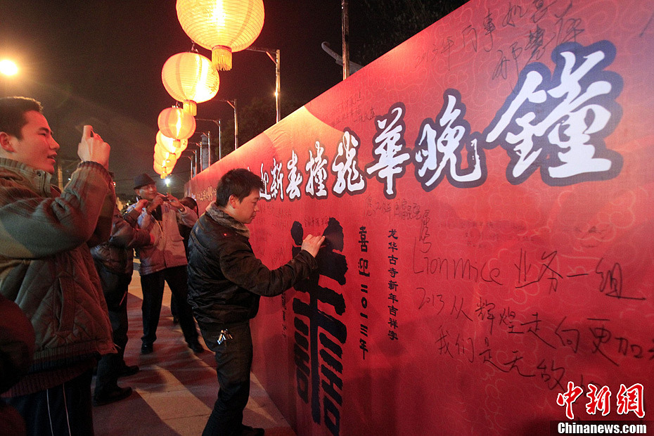12月31日晚开始,上海举行丰富多彩的跨年迎新活动,吸引众多市民参与。其中时尚地标新天地推出的创意光影秀表演,引爆时尚人士激情狂欢;而在名刹古寺玉佛寺举行的“2013祝福上海慈善晚会”上,当地四千户特困家庭得到了捐助;此外,“沪城八景”中唯一硕果仅存的千年“龙华晚钟”,更吸引市民接踵参加这吉祥的撞钟祈福活动。当晚,龙华古寺香客云集,特别设立的“喜欢上海的99个理由”签名墙晒出了民众的幸福和期盼。中新社发 潘索菲 摄