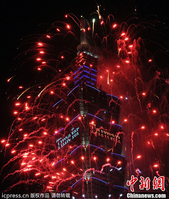 2013年1月1日凌晨零时,作为世界知名的跨年烟火之一,台北101大楼施放以“火鸟”为设计概念、以“舞动未来”为主题的烟火,首次采法式浪漫风格,耗资3000万新台币,持续188秒。加上附近的2013年台北跨年晚会,吸引了逾80万民众和游客,跟着璀璨烟火秀一起迎来新的一年。图片来源:东方IC 版权作品 请勿转载