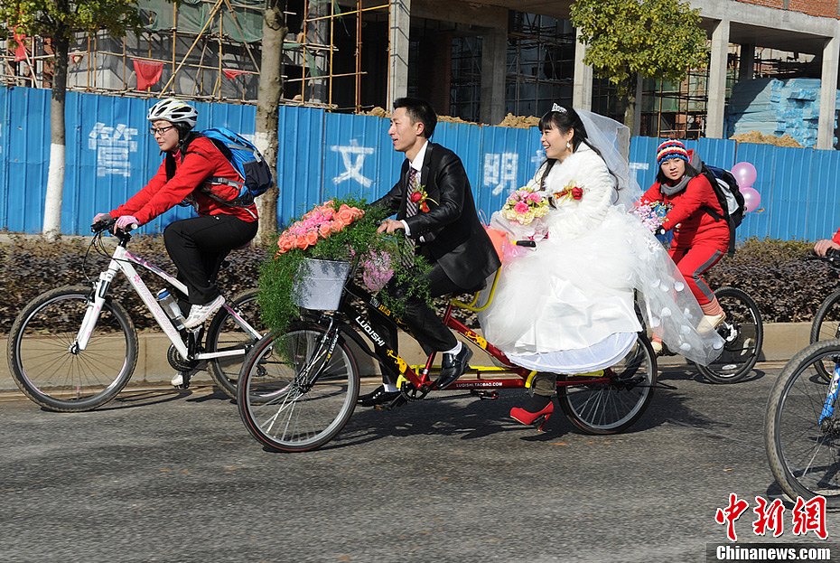 1月1日,世界各地的人民用不同的方式来迎接新年的到来。长沙一新郎携99位车友骑自行车接新娘,用这种“低碳”的方式迎接新娘和2013年的到来。图为新郎载着新娘骑行在街头。杨华峰 摄