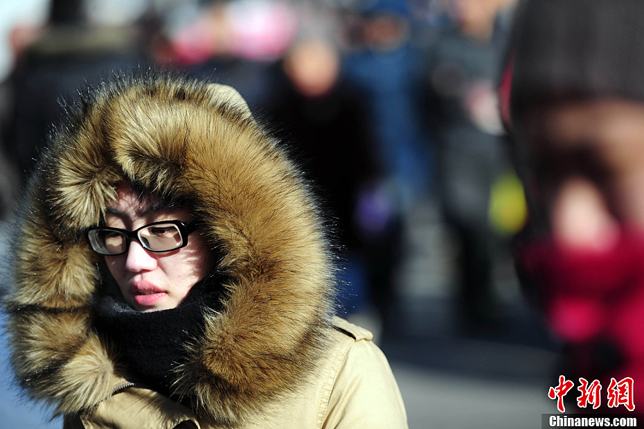 2013年1月1日,沈阳再次迎来“大冷天”,给市民出行带来不便,沈阳今天最高天气为零下14℃,最低气温为零下27℃。图为市民在寒冷天气出行。中新社发 于海洋 摄