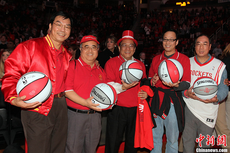 当地时间12月31日,新年夜,美国NBA休斯敦火箭队主场对阵亚特兰大老鹰队,休斯敦五位侨界知名人士应邀与首发球员交换篮球。当日,两千华裔球迷到现场助威,与华裔球星林书豪共跨新年。中新社发 贾忠 摄