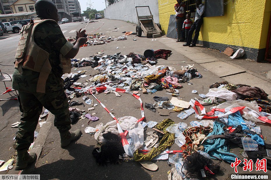 当地时间2013年1月1日,科特迪瓦阿比让市举行庆祝新年的烟火表演时发生了严重的踩踏事故,造成至少60人丧生,多人受伤。图为事故发生后的现场。