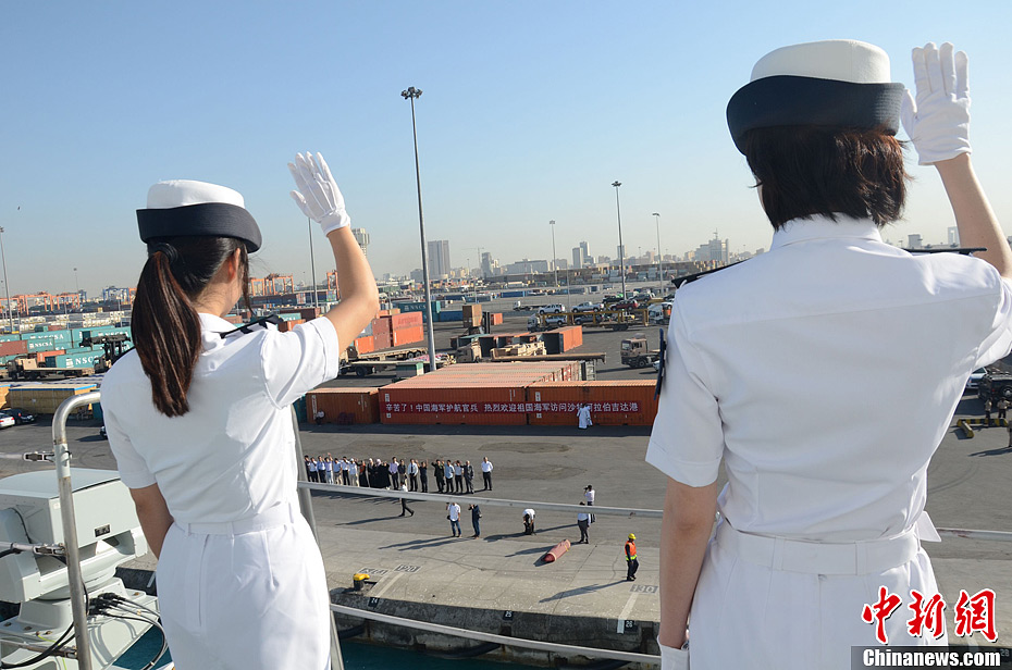 当地时间1月1日上午,第十三批护航编队黄山舰抵达沙特阿拉伯吉达港,开始为期5天的靠港补给休整。图为护航官兵分区列队向欢迎人群挥手致意。中新社发 肖德伦 摄