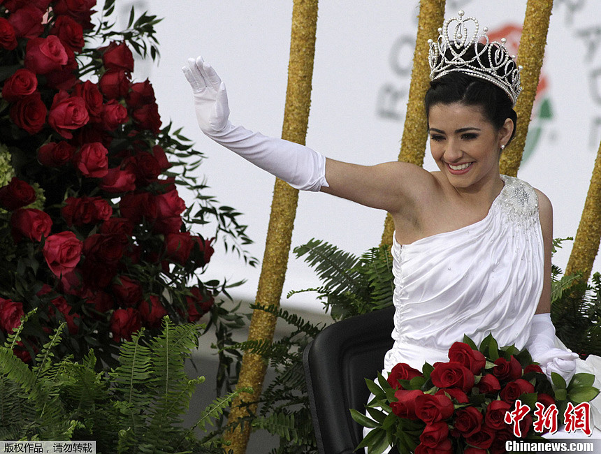 当地时间2013年1月1日,在美国加利福尼亚州帕萨迪纳举行第124届帕萨迪纳玫瑰花车游行。帕萨迪纳玫瑰花车游行有100多年历史,被认为是除纽约时报广场新年倒计时活动之外,美国境内规模最大、吸引观众最多的新年活动。今年,来自全美及世界各地的42辆用玫瑰花及其他鲜花装饰的大型花车和数十支行进乐队的表演,吸引了约百万观众到现场观看。