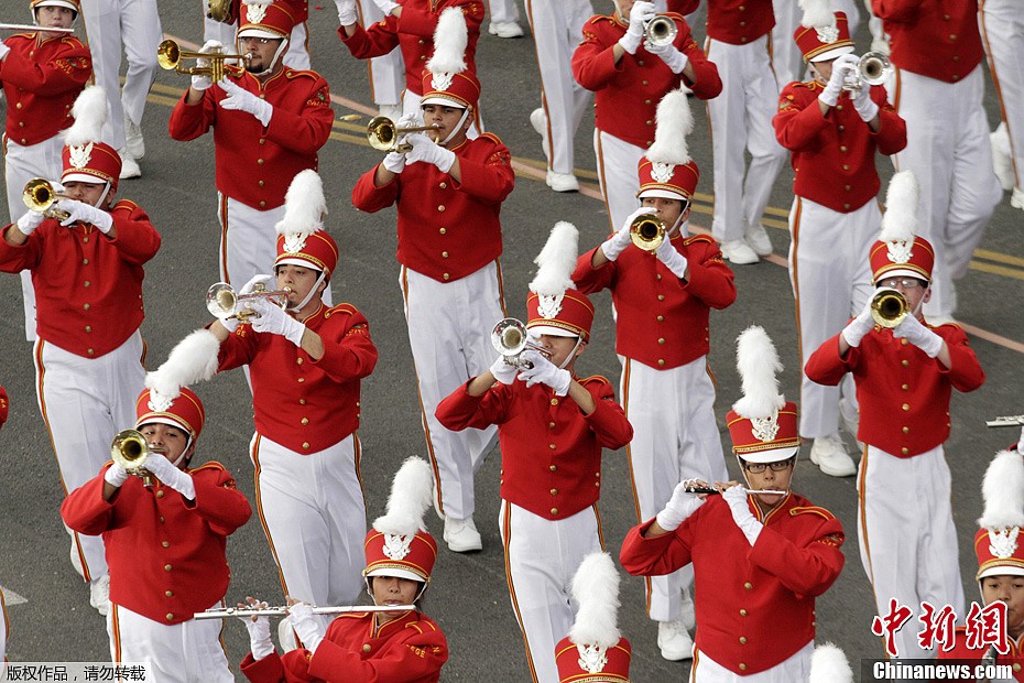当地时间2013年1月1日,在美国加利福尼亚州帕萨迪纳举行第124届帕萨迪纳玫瑰花车游行。帕萨迪纳玫瑰花车游行有100多年历史,被认为是除纽约时报广场新年倒计时活动之外,美国境内规模最大、吸引观众最多的新年活动。今年,来自全美及世界各地的42辆用玫瑰花及其他鲜花装饰的大型花车和数十支行进乐队的表演,吸引了约百万观众到现场观看。
