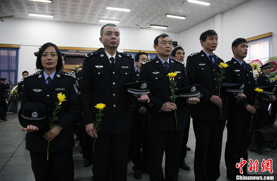 1月1日,浙江杭州萧山友成机工有限公司发生火灾,三名消防官兵因公殉职。2日,在萧山殡仪馆内,公安民警向殉职消防官兵脱帽献花。江耘 摄