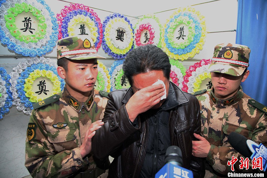 1月1日,浙江杭州萧山区友成机工凌晨一把大火,三名消防官兵在救援中不幸因公殉职。图为其中殉职的一名消防战士陈伟父亲在儿子遗体前擦眼泪。江耘 摄
