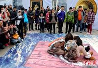 1月2日,新年假期第二天。“每个人心中都有一只孟加拉虎”奇幻3D立体画展在福州古街展出,画展邀请理查德.帕克、马林鱼、赛林、九色鹿、等待伯乐的好马、霸王龙等动物明星和观众亲密接触,现“身”说画,让民众轻松感受3D立体画艺术的魅力。图为在该画展现场举行的“可以亲近的动物世界”主题3D人体彩绘秀展示,吸引观众眼球。中新社发 刘可耕 摄