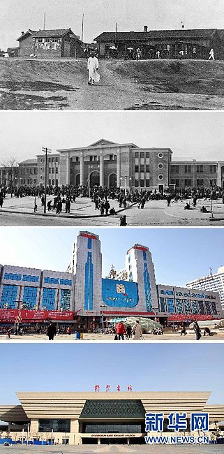 拼版照片。从上至下依次为: 清末民初的郑州火车站(资料照片)。 1956年11月开始使用的郑州火车站(资料照片)。 1999年12月改建后投入使用的郑州火车站(2009年1月24日王颂摄)。 2012年9月28日建成投入使用的郑州东站(2012年9月30日王颂摄)。 2012年12月26日,京广高铁全线贯通,同时,徐(州)兰(州)高铁郑州至徐州段也正式开工建设,标志着郑州这座“被火车拉来的城市”站上了中国铁路双“十”字枢纽坐标点——一方面,郑州是陇海、京广铁路交汇处;另一方面,郑州成为京广、徐兰两条高铁的交汇处。郑州车站经历了百年变化。 1897年,清政府修筑芦(沟桥)汉(口)铁路。1904年3月,郑州火车站(时称郑县站)建成。1906年全线通车后,郑州站被定为甲等车站。1914年陇海铁路开(封)洛(阳)线正式投入运营,奠定了郑州火车站路网中心的基础。由于封建割据、战争频繁、路政败坏等原因,郑州火车站设施简陋,运输效率极低。新中国成立后,随着客运量的日益增长和铁路旅客运输的需求,郑州火车站多次进行改建和维修。 1953年,郑州火车站改扩建工程动工,1956年投入使用,并先后分离出货运站、编组站和以运输旅客为主的客运站。为适应经济发展的需要,1988年郑州站再次进行改扩建工程。1999年12月28日,随着主站楼的投入使用,长达12年的改扩建工程落下帷幕。呈现在世人面前的新郑州站,日接送旅客列车330多列,每天过往人流近15万人次,是全国铁路特等客运站,也是我国最大的铁路行包中转站,被称为中国铁路客运的“心脏”。近年来,随着铁路大提速和高速铁路的建设发展,原有的郑州火车站已显得“力不从心”。2012年9月28日,随着京广高铁(郑州至武汉段)的开通,我国中部地区最大的高速铁路编组站——郑州东站,正式投入运营。以郑州东站为中心,500公里为半径的圆覆盖中国3.5亿人口,700公里为半径的圆覆盖7.2亿人口,而这两个圆,都在两小时高铁交通圈内。经过百年变迁的郑州车站,是我国铁路建设历程中的一个缩影。而依托铁路交通优势发展起来的郑州市,也成为“经济发展,交通先行”的有力佐证。图片来源:新华网
