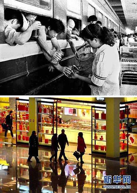 拼版照片。上图:车站工作人员在站内为车上的旅客倒水(1992年7月摄)。下图:几名旅客经过车站候车大厅内的购物区(2012年12月25日摄)。新华社记者 王颂 摄 图片来源:新华网