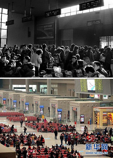 拼版照片。上图:旅客们在车站的候车厅内等待进站(2005年1月30日摄)。下图:旅客们在宽敞的候车区候车(2012年12月26日摄)。 新华社记者 王颂 摄 图片来源:新华网