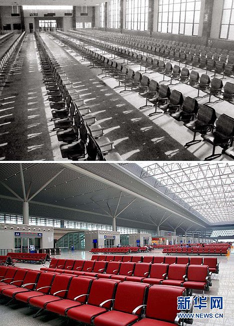 拼版照片。上图:上世纪90年代初郑州火车站候车大厅的木质座椅(1993年10月摄)。下图:郑州东站候车大厅新安装的座椅(2012年9月22日摄)。 新华社记者 王颂 摄 图片来源:新华网