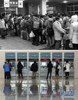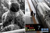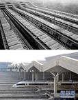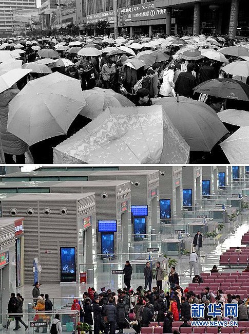 拼版照片。上图:在露天候车的大批旅客冒雨涌入车站(2007年3月2日摄)。下图:候车大厅内,旅客们排队进站(2012年12月31日摄)。 新华社记者 王颂 摄 图片来源:新华网