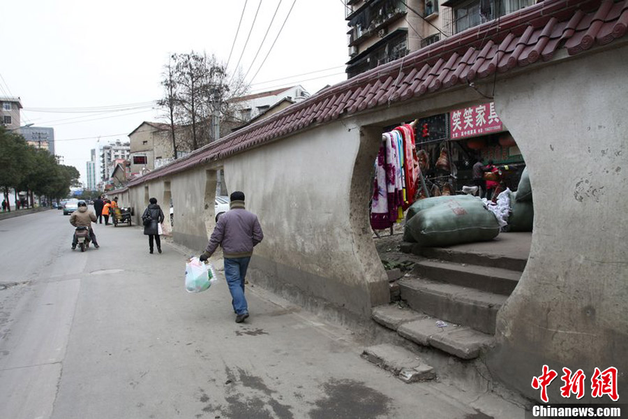 2013年1月3日,武汉麒麟路,在人行道砌的被人戏称为“遮羞墙”的围墙。这样的墙有四处,墙顶贴有琉璃瓦,从临街门面到墙根大约有3米的距离,不少行人走在本来就不宽的机动车道上,经常导致堵车。这堵墙开着各种形状的拱门供行人穿行,在小区或菜场门口,该墙还留出较大的缺口,方便车辆进出。围墙内,不少摊贩摆摊,一些摊主直接拉起雨布搭在围墙上,雨布下摆设桌椅、货物,俨然成了自己店面的一部分。甚至墙外也停着车辆等物品。楚林 摄 图片来源:CFP视觉中国
