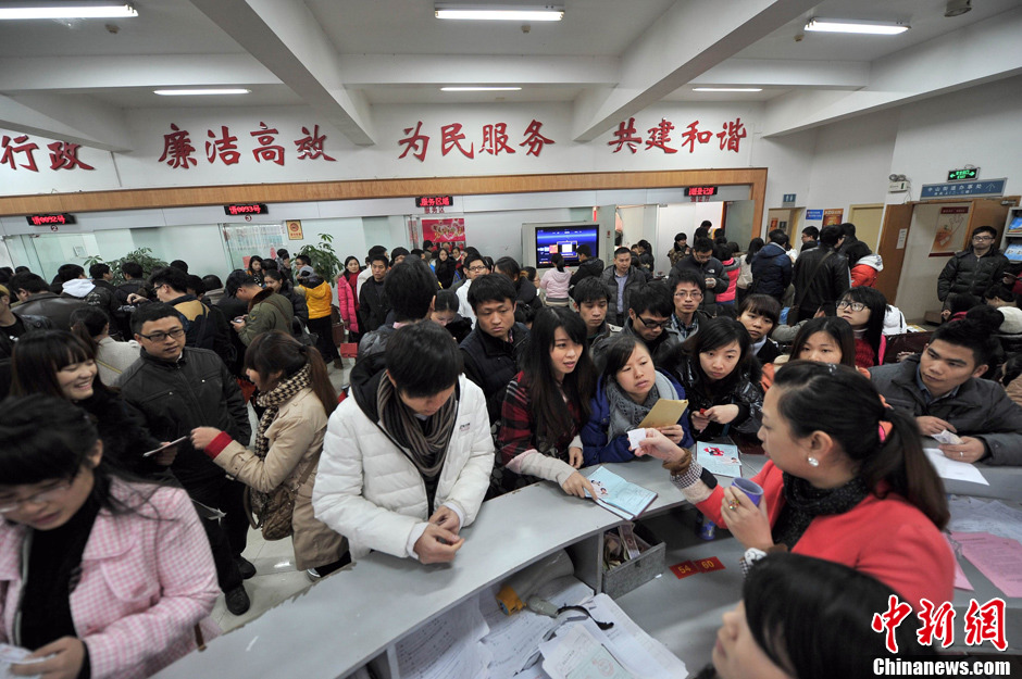 1月4日,广西南宁,数百对情侣赶到青秀区民政局登记结婚,取日期“1314”的谐音,欲携手一生一世。图为登记大厅围满准备办理结婚登记的情侣。中新社发 洪坚鹏 摄