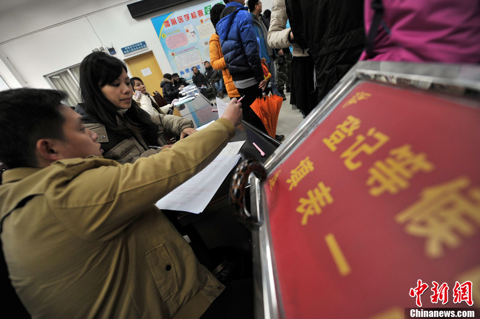 1月4日,广西南宁,数百对情侣赶到青秀区民政局登记结婚,取日期“1314”的谐音,欲携手一生一世。图为登记大厅围满准备办理结婚登记的情侣。中新社发 洪坚鹏 摄