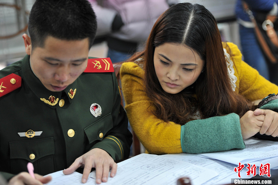2013年1月4日,广西南宁,数百对情侣赶到南宁市青秀区民政局登记结婚,取日期“1314”的谐音,欲携手一生一世。图为一对正在填写表格的情侣。中新社发 洪坚鹏 摄