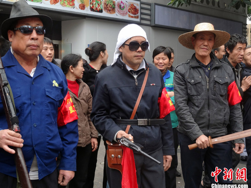 2013年1月3日下午,深圳巴丁街,沉寂数年的“打假倡廉武工队”再次现身。据策划人比特称,“武工队”此次复出,是在响应“反腐倡廉”新号召。这7名新队员中,有几位是杀猪能手。“打假倡廉武工队”于数年前在深圳华强北商业街首度亮相,曾因扛枪巡逻雷倒真警察而走红网络。图片来源:东方IC 版权作品 请勿转载