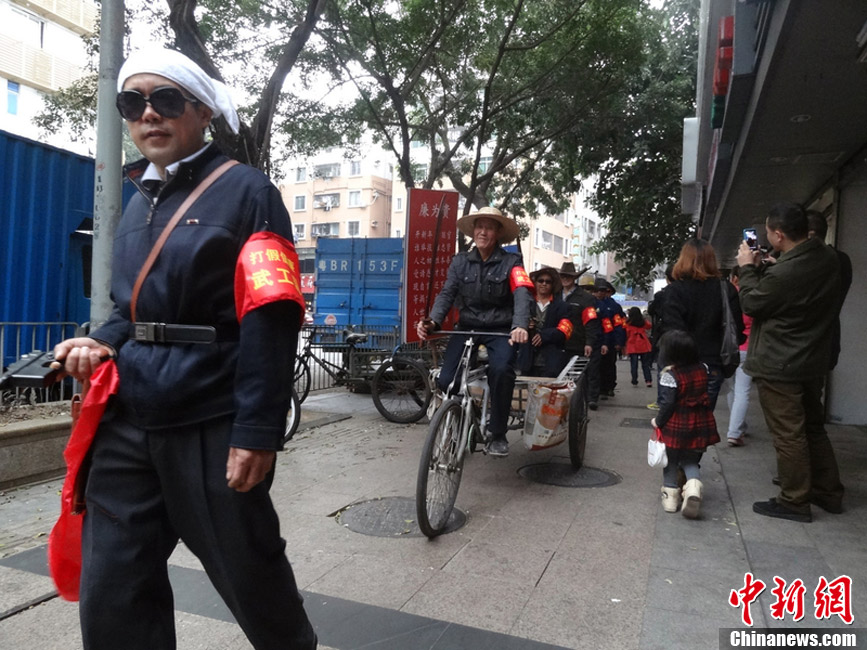 2013年1月3日下午,深圳巴丁街,沉寂数年的“打假倡廉武工队”再次现身。据策划人比特称,“武工队”此次复出,是在响应“反腐倡廉”新号召。这7名新队员中,有几位是杀猪能手。“打假倡廉武工队”于数年前在深圳华强北商业街首度亮相,曾因扛枪巡逻雷倒真警察而走红网络。图片来源:东方IC 版权作品 请勿转载