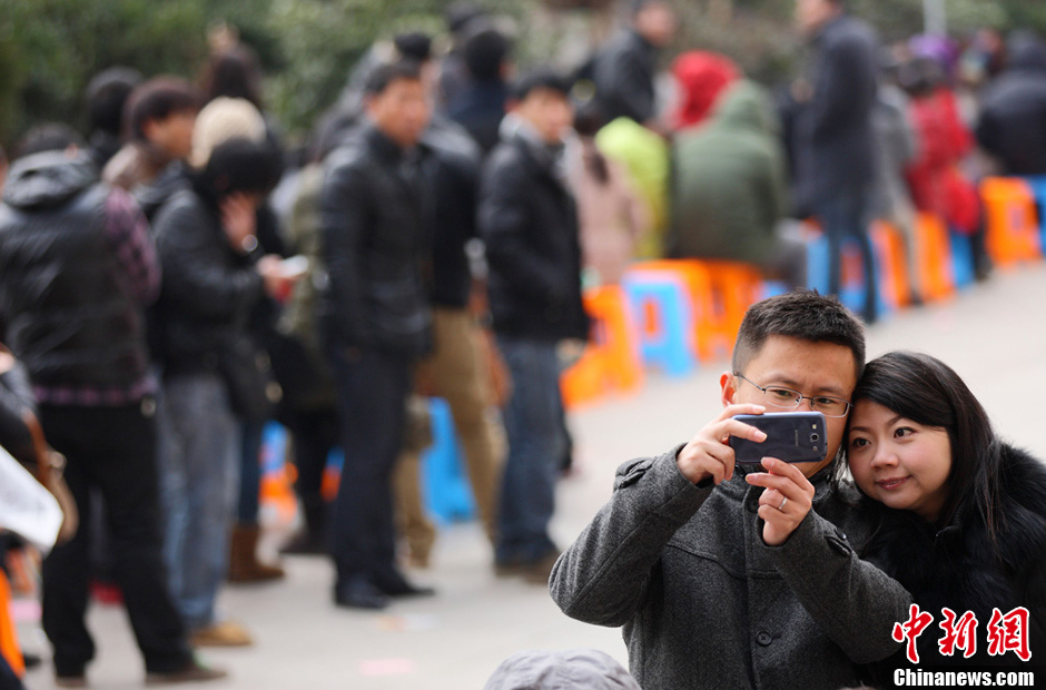1月4日,因其谐音“爱你一生一世”,备受年轻人的青睐,不少准人们前往当地婚姻登记处“赶吉”登记注册,与心爱的人“情定终身”。图为准新人们在南京玄武区民政局门口排队等候进入办理结婚证时拍摄留影。中新社发 泱波 摄