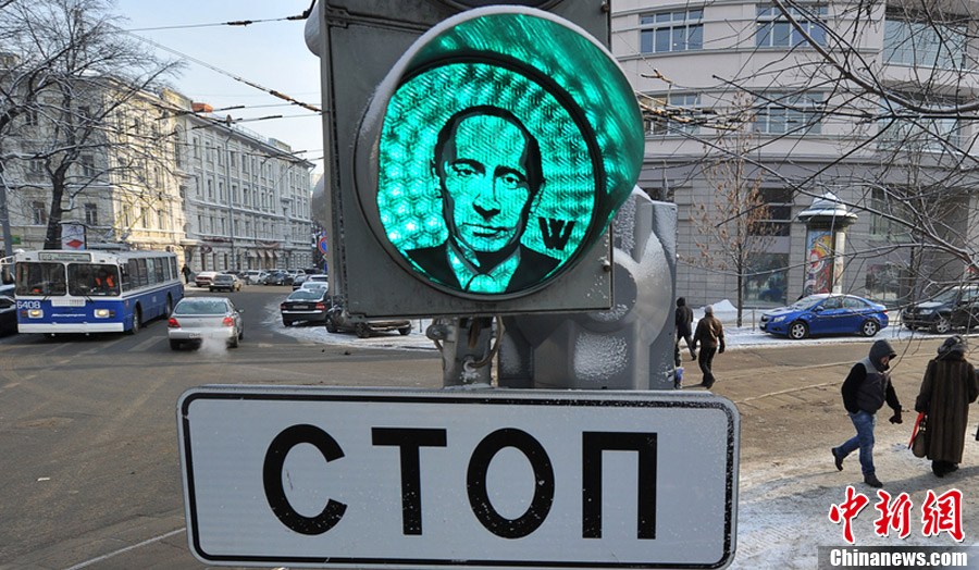 2012年2月13日,俄罗斯莫斯科街头现“普京版交通信号灯”,支持者希望群众为普京“亮起绿灯”。 图片来源:东方IC 版权作品 请勿转载