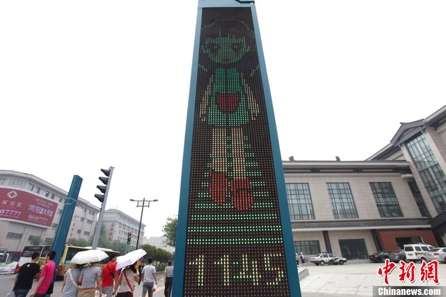 2012年7月17日,西安最萌LED红绿灯亮相北大街。这个红绿灯与以往不同,卡通人物为一个小女孩,绿灯亮时,小女孩倒计时报数,红灯亮时,小女孩播送文明提示语。卡通红绿灯的出现得到了很多市民的赞许,并亲切的称之为西安“最卖萌”红绿灯。丁聘 摄 图片来源:CFP视觉中国