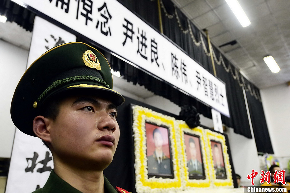 2013年1月4日,杭州萧山大火三位消防烈士的追悼会在萧山区殡仪馆举行,社会各界人士沉痛悼念因救火而殉职的杭州消防支队萧山中队特勤分队分队长尹进良、萧山中队战士陈伟、萧山市北中队战士尹智慧。1月1日凌晨,萧山区瓜沥镇一公司厂房发生特大火灾,三名消防官兵为扑灭大火而不幸英勇殉职。2日,三人被追认为烈士并颁发献身国防金质纪念章,追记个人一等功。图为一名守护烈士灵柩的武警战士满眼泪水。中新社发 李忠 摄 图片来源:CNSPHOTO