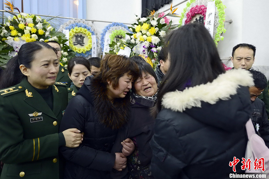 2013年1月4日,杭州萧山大火三位消防烈士的追悼会在萧山区殡仪馆举行,社会各界人士沉痛悼念因救火而殉职的杭州消防支队萧山中队特勤分队分队长尹进良、萧山中队战士陈伟、萧山市北中队战士尹智慧。1月1日凌晨,萧山区瓜沥镇一公司厂房发生特大火灾,三名消防官兵为扑灭大火而不幸英勇殉职。2日,三人被追认为烈士并颁发献身国防金质纪念章,追记个人一等功。图为消防烈士的亲属在追悼会上悲痛欲绝。中新社发 李忠 摄 图片来源:CNSPHOTO