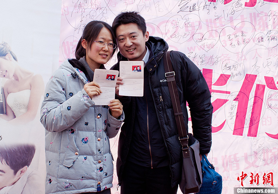 2013年1月4日,因谐音“爱你一生一世”而被年轻情侣认为是登记结婚的好日子。当日,在郑州市金水区民政局婚姻登记处,登记结婚的情侣们排起了500米左右的长队。有的情侣于凌晨2时就开始排队,冬日严寒阻挡不了爱的温暖。图为凌晨就来排队的夫妻得偿所愿。郭彬 摄