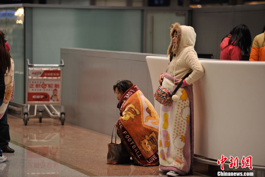 昆明机场航班延误 滞留旅客身披毛毯御寒