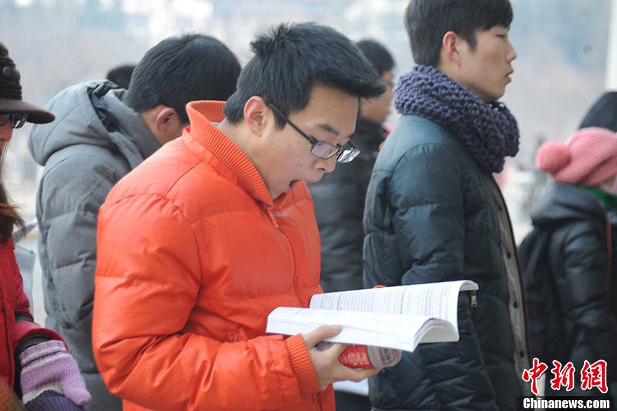 1月5日,180万考生走进考场,参加“史上最严”的2013年全国硕士研究生招生考试。本次考试部分科目将实行“一题多卷”防止作弊,同时,通讯设备一经发现携带入场即视作违规处理,作弊者将受到停止国家各类教育考试最高3年的处罚。图为1月5日,在山东聊城大学考点,参加2013年全国硕士研究生招生考试的考生做最后努力。董光强 摄 图片来源:CFP视觉中国