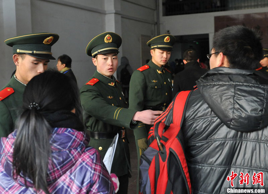 1月5日,180万考生走进考场,参加“史上最严”的2013年全国硕士研究生招生考试。本次考试部分科目将实行“一题多卷”防止作弊,同时,通讯设备一经发现携带入场即视作违规处理,作弊者将受到停止国家各类教育考试最高3年的处罚。图为1月5日早上8点,济南,浩浩荡荡的考生开始入场,武警战士负责检查证件。图片来源:CFP视觉中国