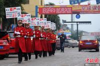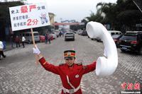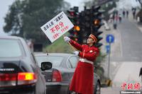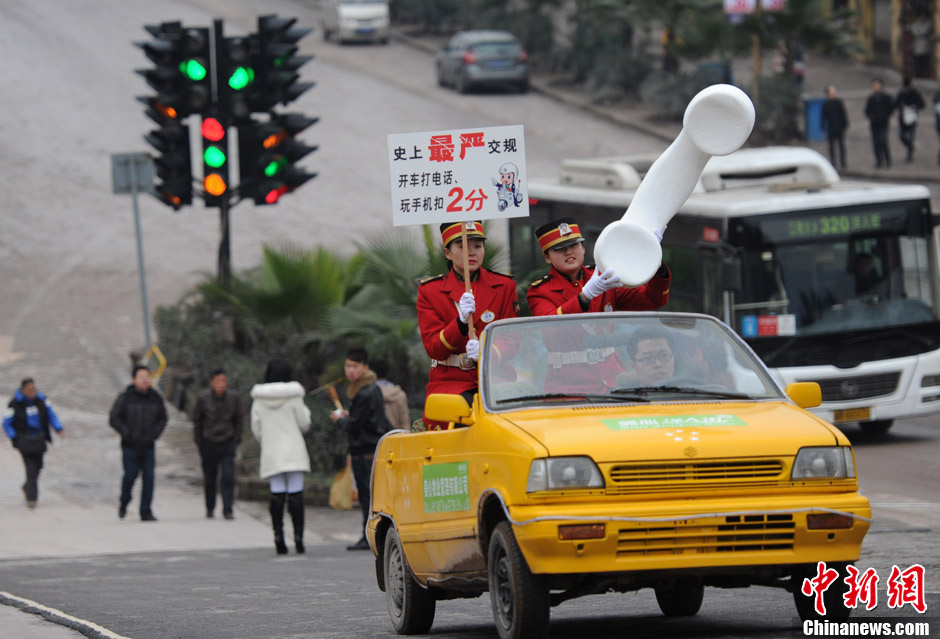 1月5日,重庆市洋人街上穿着“军装礼服”的工作人员举着各种交通新规条例正在街头巡游。洋人街“红绿灯”处工作人员举着在此“闯黄灯”不扣分(全国唯一、下不为例)牌,利用调侃的方式,提醒广大市民以后不能闯黄灯。“抢黄灯扣六分、开车打电话玩手机扣两分、遮挡污损号牌扣十二分、超速百分之五十扣十二分”等工作人员举着交通新规条例在洋人街上进行巡游,提醒广大市民开车要遵守新的交通规则。