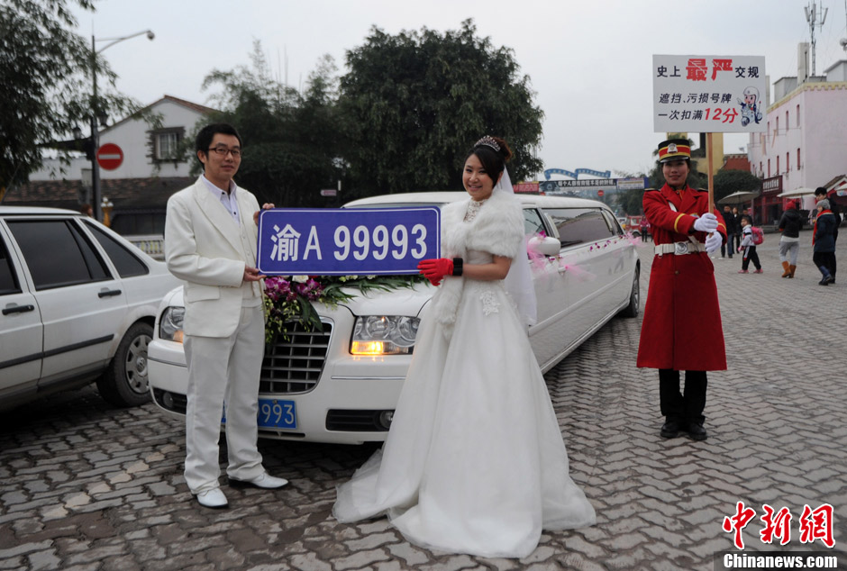 1月5日,重庆市洋人街上穿着“军装礼服”的工作人员举着各种交通新规条例正在街头巡游。图为洋人街工作人员举着“遮挡污损号牌扣十二分”牌进行巡游宣传新交规。陈超 摄
