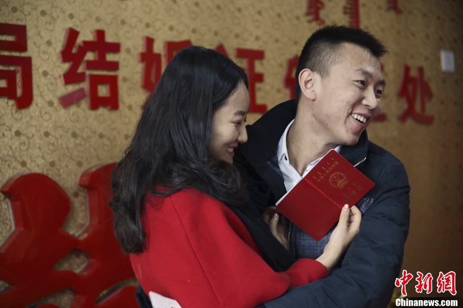 2013年1月4日,因谐音“爱你一生一世”受到年轻人的青睐。2013年1月4日,内蒙古呼和浩特,很多情侣在这一天领取了他们的结婚证,取谐音,欲牵手“一生一世”。图为婚姻登记处刚刚领证的“小夫妻”。中新社发 刘文华 摄