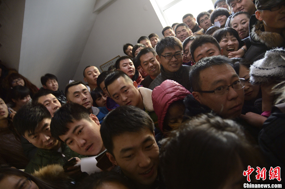 2013年1月4日,因谐音“爱你一生一世”受到年轻人的青睐。2013年1月4日,内蒙古呼和浩特,很多情侣在这一天领取了他们的结婚证,取谐音,欲牵手“一生一世”。图为婚姻登记处新人扎堆的热闹场面。中新社发 刘文华 摄