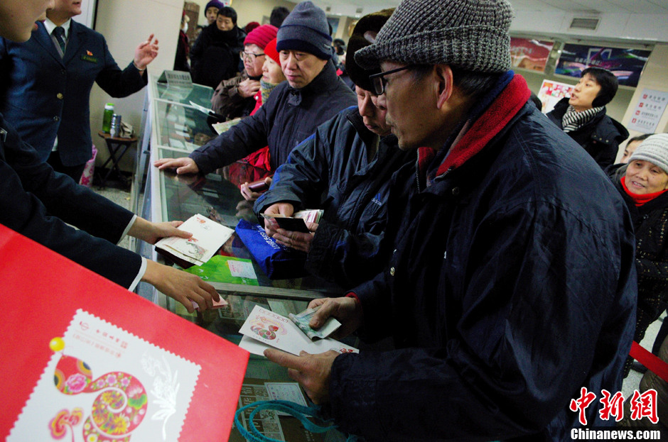 中国邮政《癸巳年》蛇票于2013年1月5日开始全国发售。该邮票是中国邮政生肖邮票中第三轮的第十套,由清华大学美术学院教授吴冠英设计,设计采用了红底花纹蛇,蛇身上有众多中国传统花卉图案,其中包括牡丹、荷花等,蛇尾处以彩色的祥云修饰,寓意吉祥。图为北京某发售现场。中新社发 贾天勇 摄