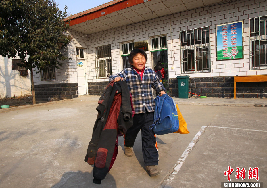 1月5日,河南兰考县“1.04”火灾发生后,兰考县对袁厉害收养的其他10名孩子进行安置。图为孩子收拾行李奔向开往市福利院的汽车。中新社发 王中举 摄