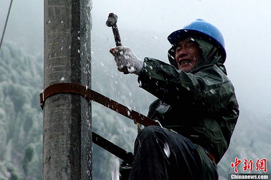 福建北部现冻雨 供电员工破冰抢修