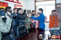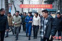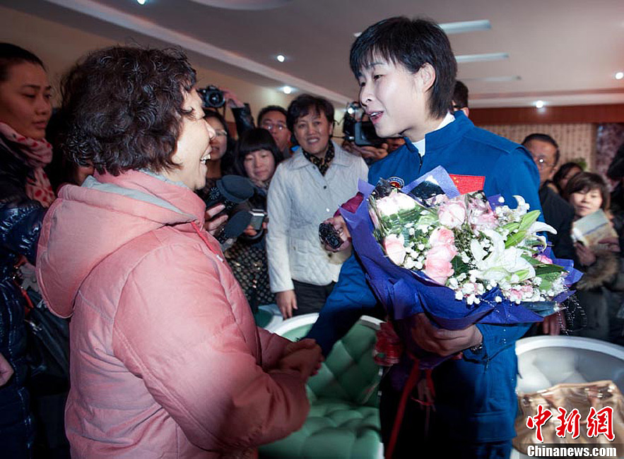 1月5日上午,神舟九号女航天员刘洋回到自己曾经就读的初中母校——郑州三中,看望恩师,表达谢意,与学弟学妹共话人生理想。刘洋,祖籍河南林州,生活在河南郑州,2012年6月16日,神舟九号飞船发射,刘洋和男航天员景海鹏、刘旺组成飞行乘组,执行神舟九号载人交会对接任务。图为刘洋含泪向昔日班主任王秀菊老师问好。郭斌 摄