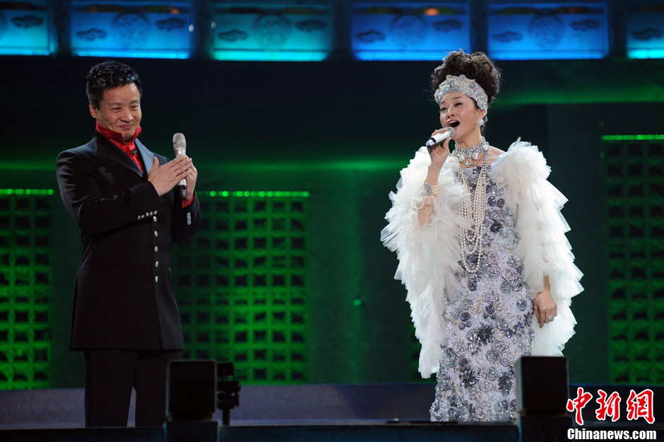 1月5日晚,“辣妹子”宋祖英2013中国巡回演唱会在山西太原举行。演出现场,宋祖英演绎了自己歌手生涯中诸多经典曲目,吸引了众多歌迷前往现场一睹巨星风采。图为太原籍歌手阎维文在宋祖英演唱会上现场助兴。中新社发 韦亮 摄